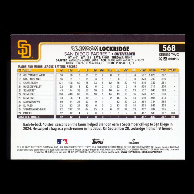 Brandon Lockridge RC 2025 Topps Rookie Padres