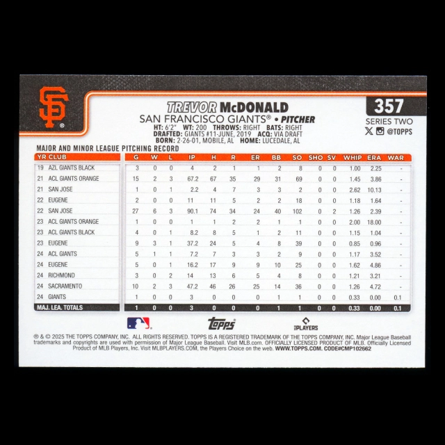 Trevor McDonald RC 2025 Topps Rookie Giants