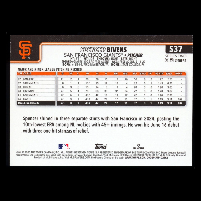 Spencer Bivens RC 2025 Topps Rookie Giants