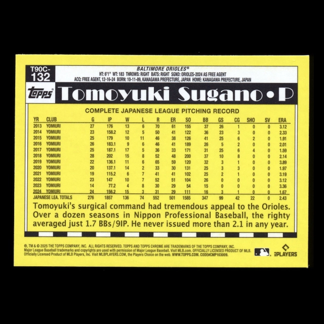Tomoyuki Sugano RC 2025 Topps '90 Topps Silver Pack Chrome Retro Rookie Orioles