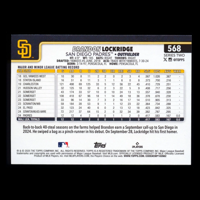 Brandon Lockridge RC 2025 Topps Rookie Padres
