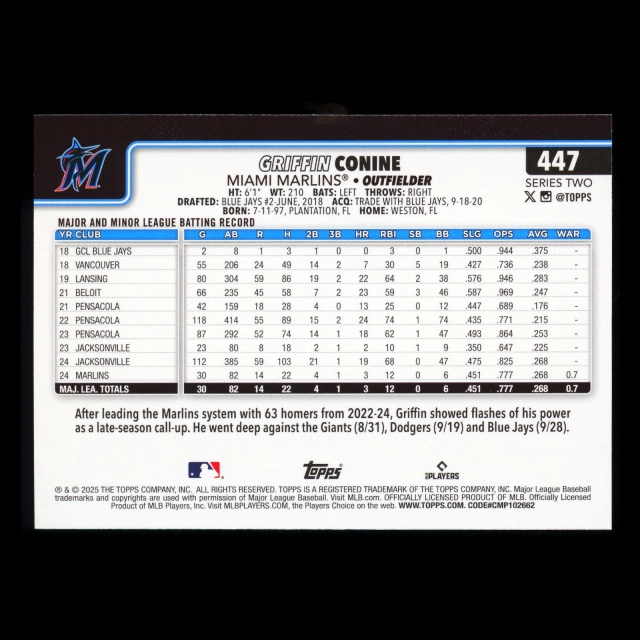 Griffin Conine RC 2025 Topps Rookie Marlins