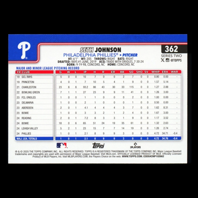 Seth Johnson RC 2025 Topps Rookie Phillies