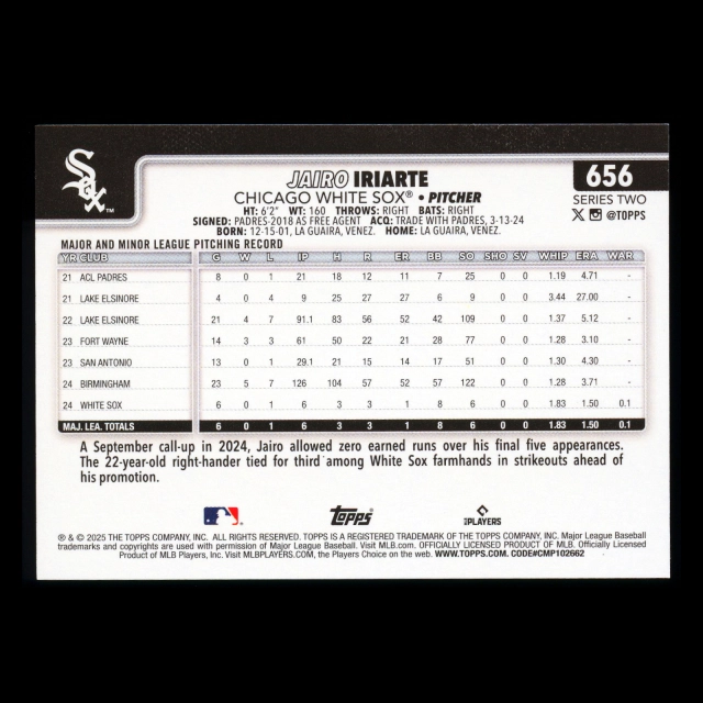 Jairo Iriarte RC 2025 Topps Rookie White Sox