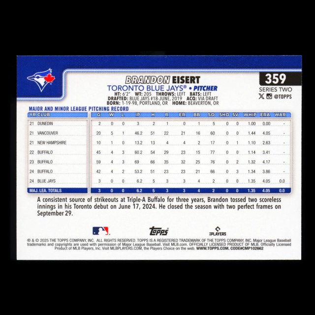Brandon Eisert RC 2025 Topps Rookie Blue Jays