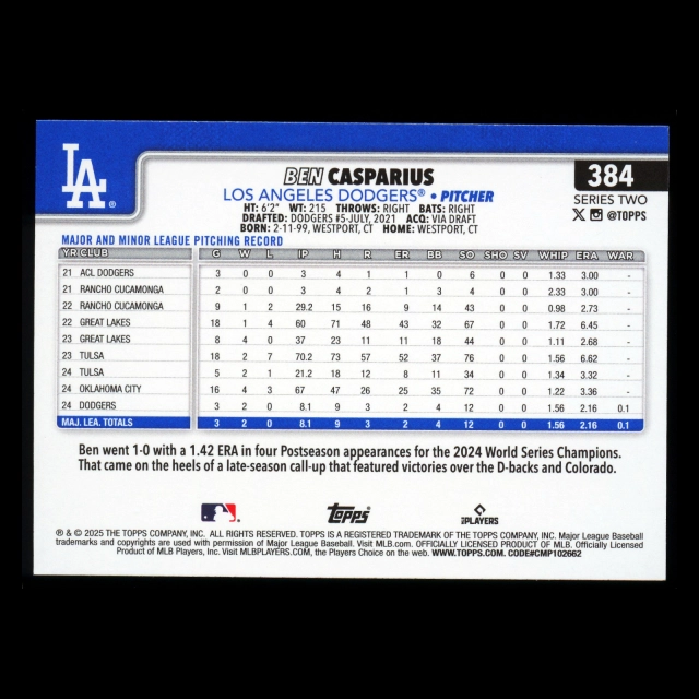 Ben Casparius RC 2025 Topps Rookie Dodgers