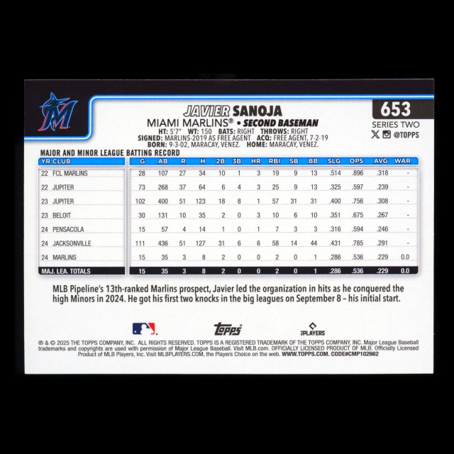 Javier Sanoja RC 2025 Topps Rookie Marlins