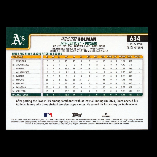 Grant Holman RC 2025 Topps Rookie Athletics