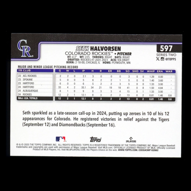 Seth Halvorsen RC 2025 Topps Rookie Rockies