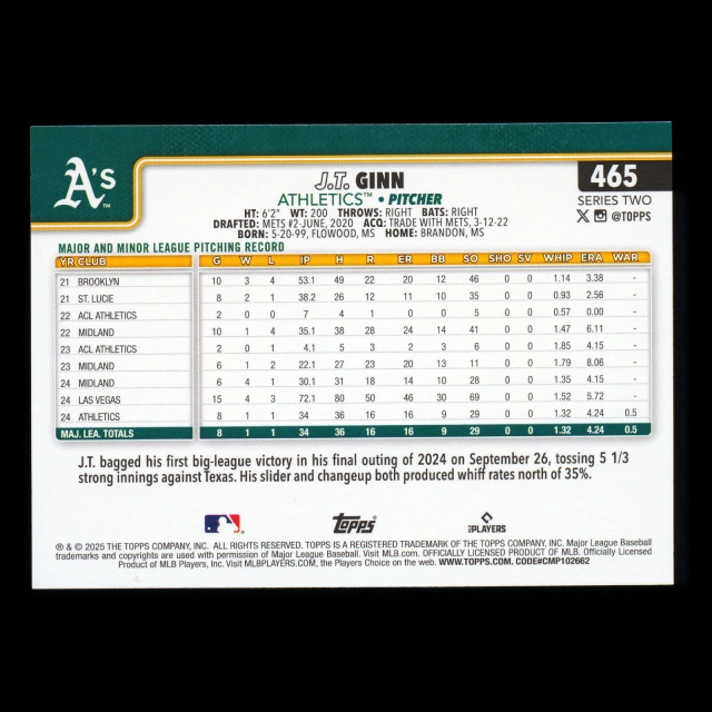 J.T. Ginn RC 2025 Topps Rookie Athletics