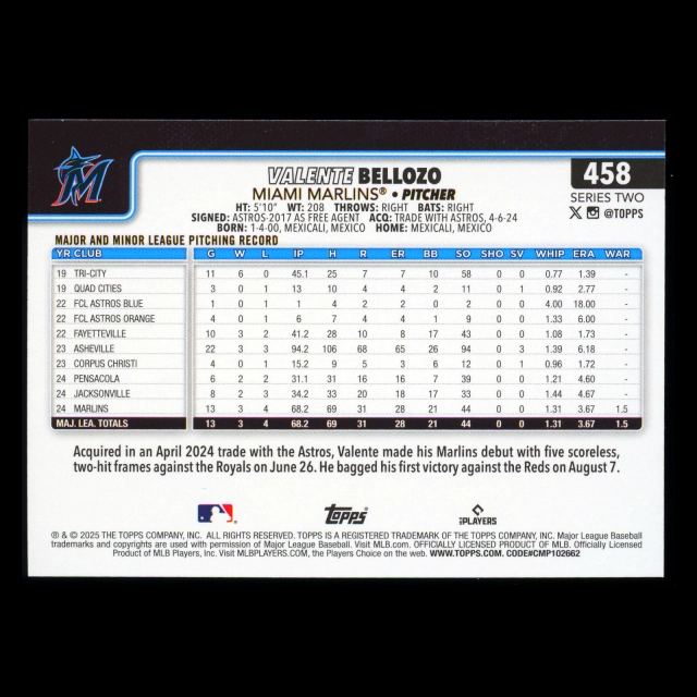 Valente Bellozo RC 2025 Topps Rookie Marlins