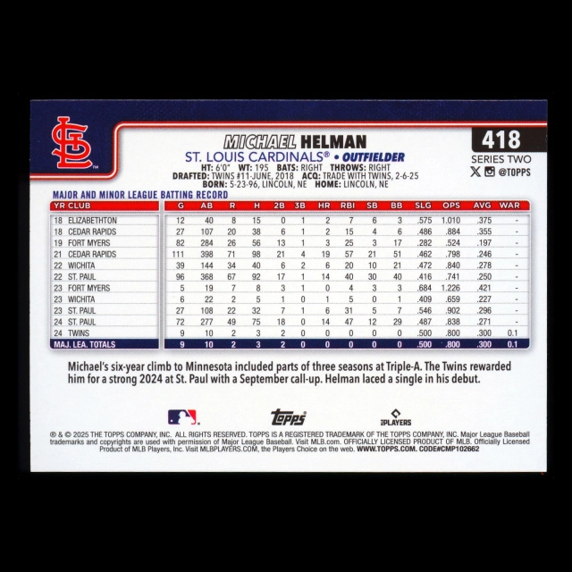 Michael Helman RC 2025 Topps Diamante Foil Rookie Cardinals