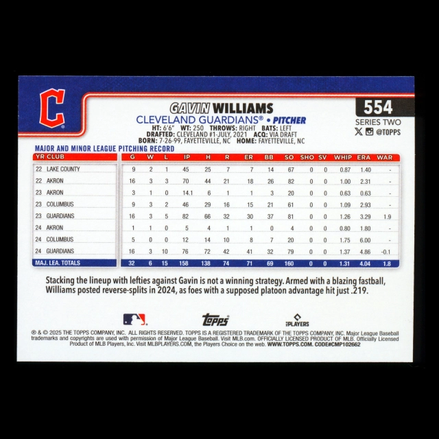 Gavin Williams 2025 Topps Future Stars Guardians