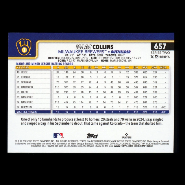 Isaac Collins RC 2025 Topps Rookie Brewers