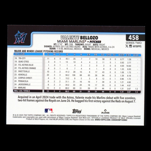Valente Bellozo RC 2025 Topps Rookie Marlins