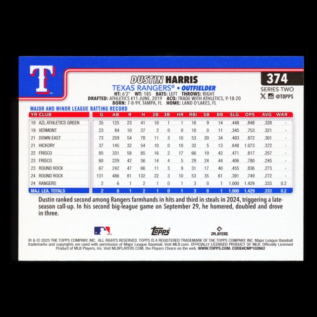 Dustin Harris RC 2025 Topps Rookie Rangers