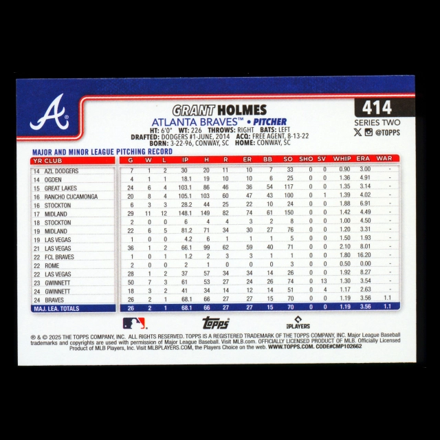 Grant Holmes RC 2025 Topps Rookie Braves