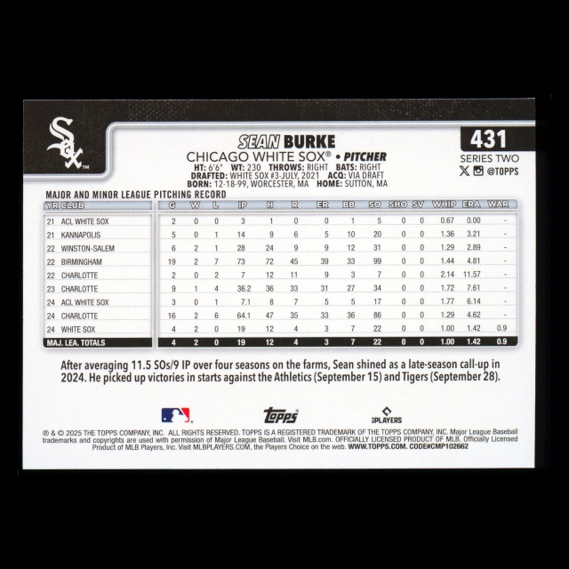 Sean Burke RC 2025 Topps Rookie White Sox