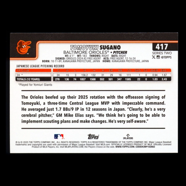 Tomoyuki Sugano RC 2025 Topps Rookie Orioles