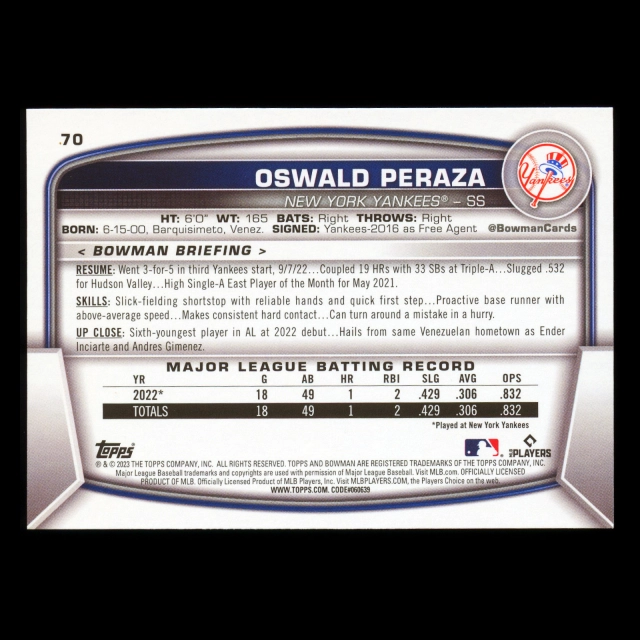 Oswald Peraza RC 2023 Bowman Rookie Yankees