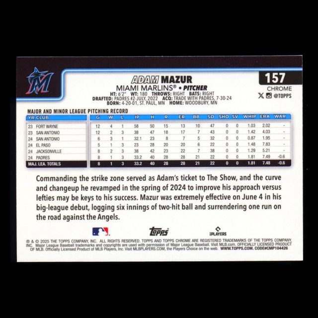 Adam Mazur RC 2025 Topps Chrome Rookie Marlins
