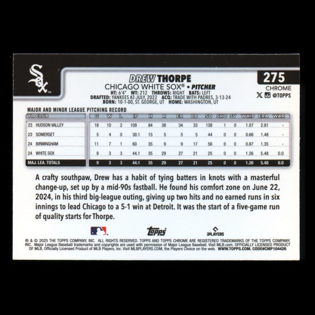 Drew Thorpe RC 2025 Topps Chrome Rookie White Sox