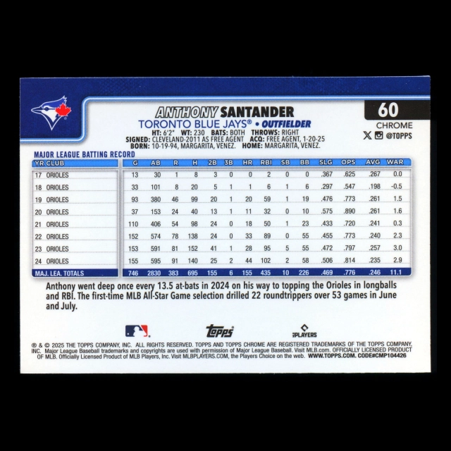 Anthony Santander 2025 Topps Chrome Blue Jays