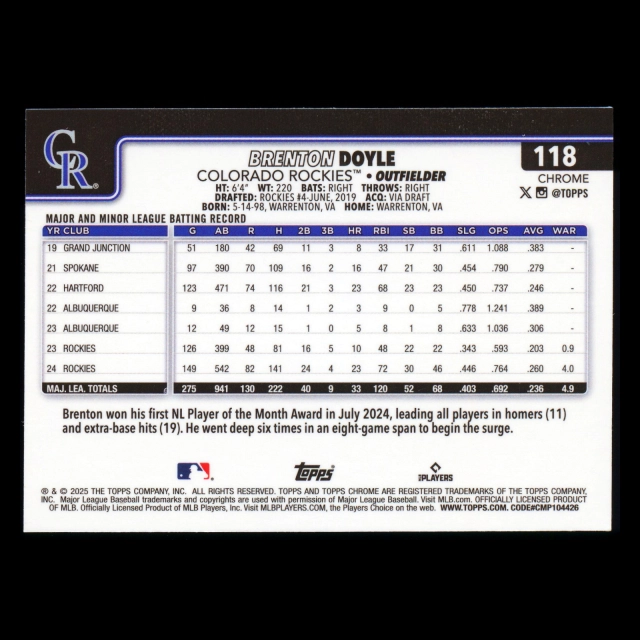 Brenton Doyle 2025 Topps Chrome Rockies