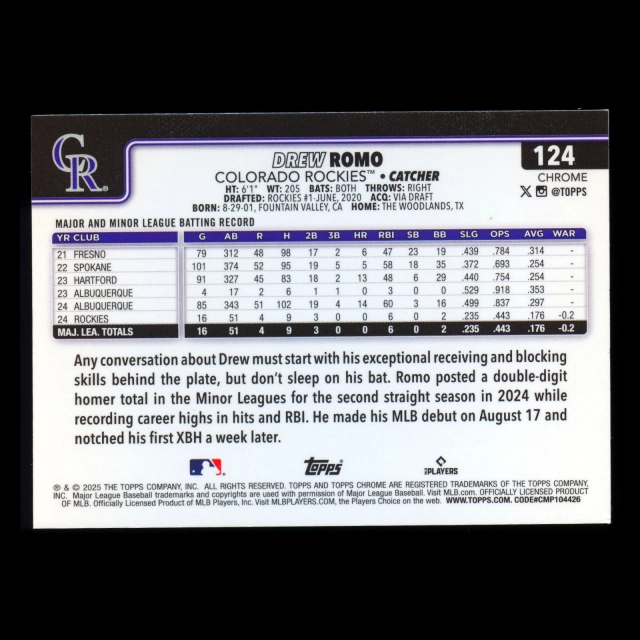 Drew Romo RC 2025 Topps Chrome Rookie Rockies