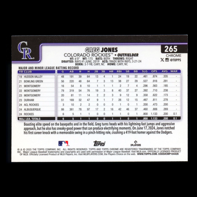 Greg Jones RC 2025 Topps Chrome Rookie Rockies