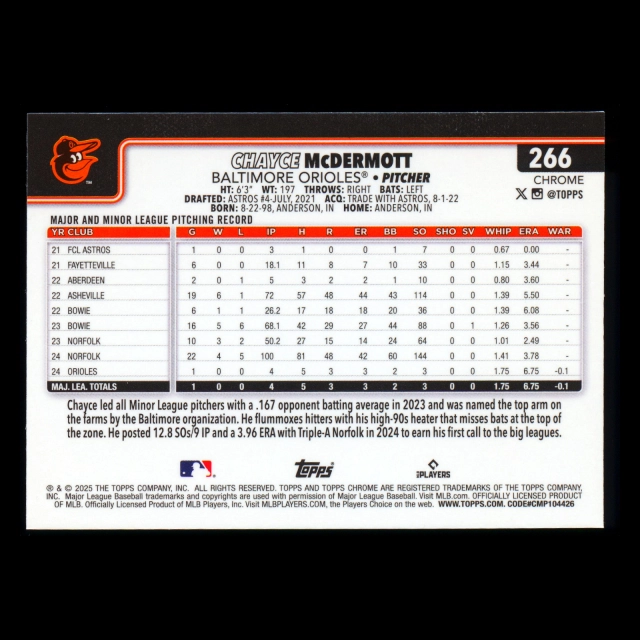 Chayce McDermott RC 2025 Topps Chrome Rookie Orioles