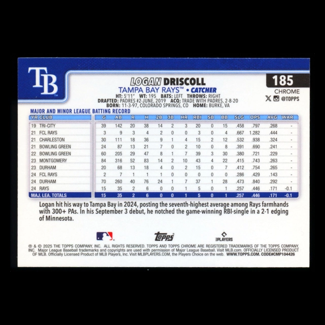 Logan Driscoll RC 2025 Topps Chrome Logofractor Rookie Rays