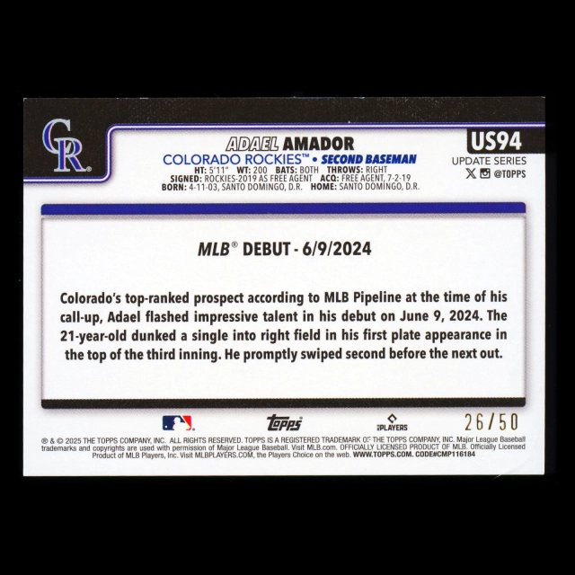 Adael Amador RC 2025 Topps Update Gold Rainbow Foil Rookie Debut Rockies 26/50