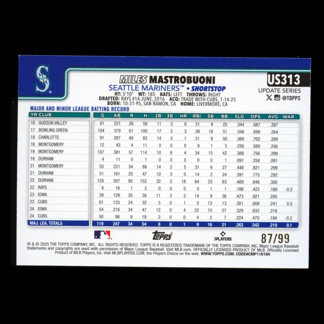 Miles Mastrobuoni 2025 Topps Update Green Rainbow Foil Mariners 87/99
