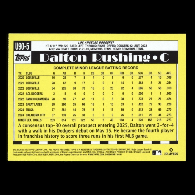 Dalton Rushing RC 2025 Topps Update '90 Topps Rookie Dodgers