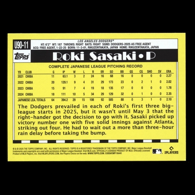 Roki Sasaki RC 2025 Topps Update '90 Topps Rookie Dodgers