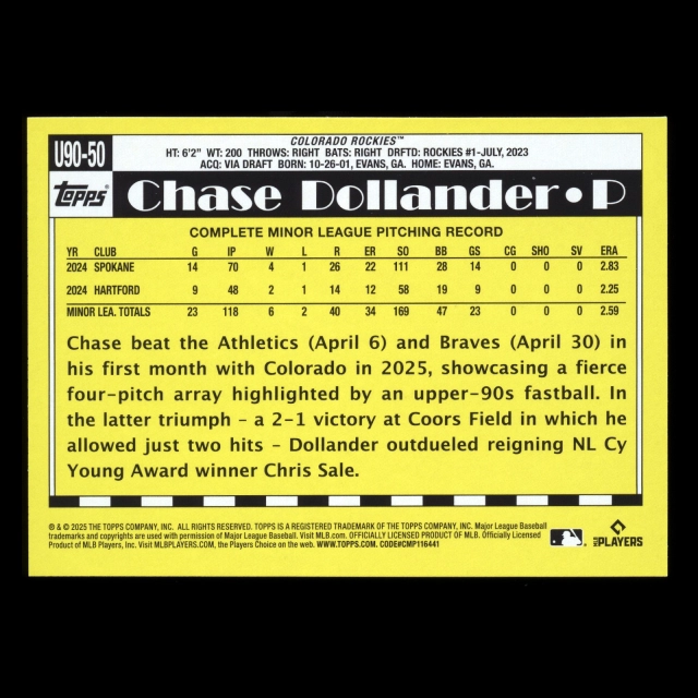 Chase Dollander RC 2025 Topps Update '90 Topps Rookie Rockies