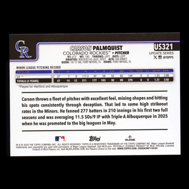 Carson Palmquist RC 2025 Topps Update Rookie Rockies