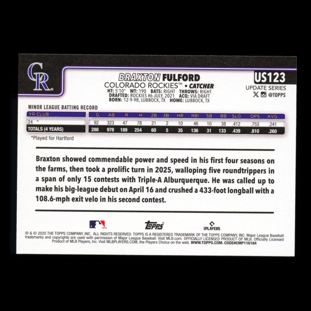Braxton Fulford RC 2025 Topps Update Rookie Rockies