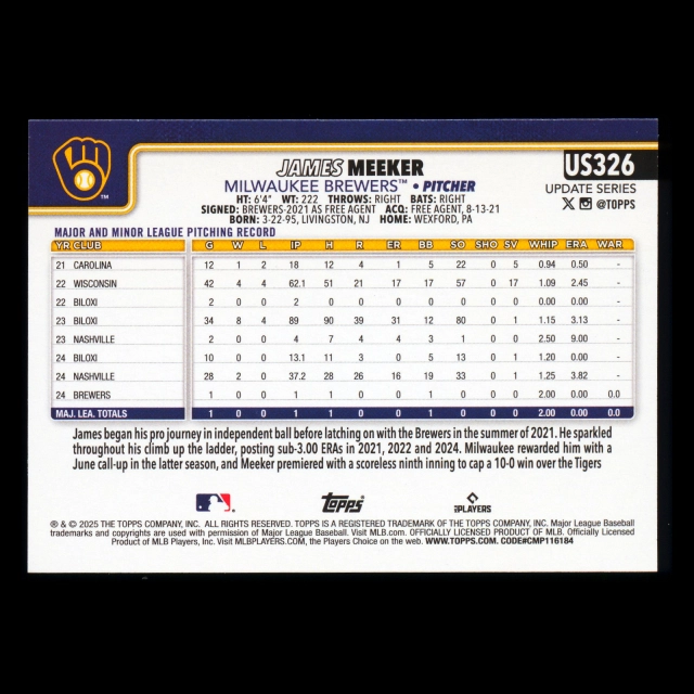 James Meeker RC 2025 Topps Update Rookie Brewers