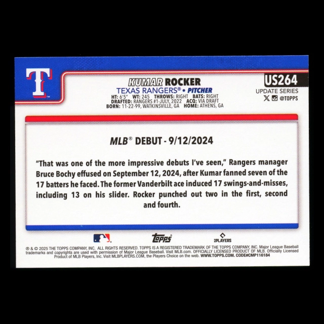 Kumar Rocker 2025 Topps Update Rookie Debut Rangers