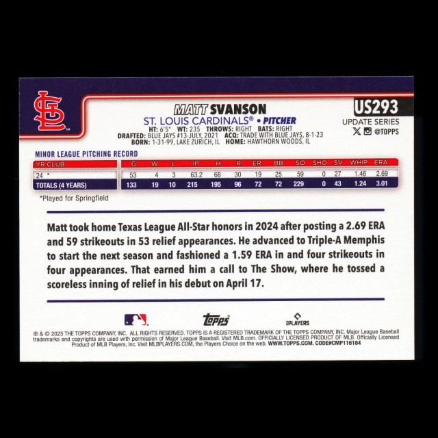 Matt Svanson RC 2025 Topps Update Rookie Cardinals