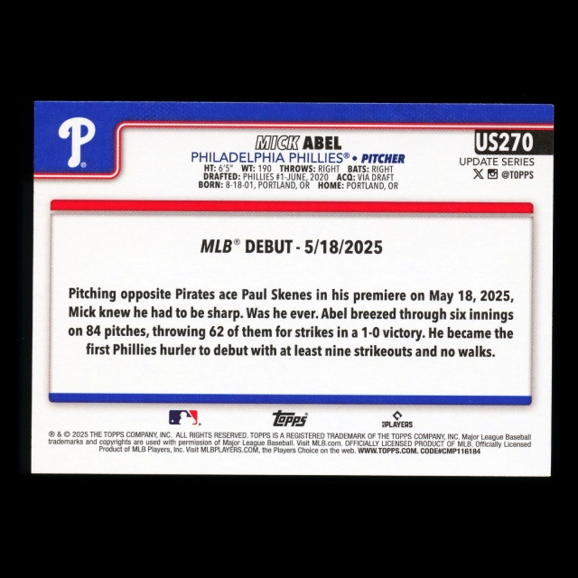 Mick Abel 2025 Topps Update Rookie Debut Phillies
