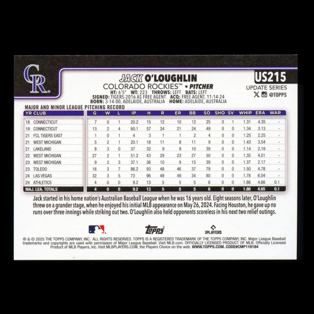 Jack OLoughlin RC 2025 Topps Update Rookie Rockies