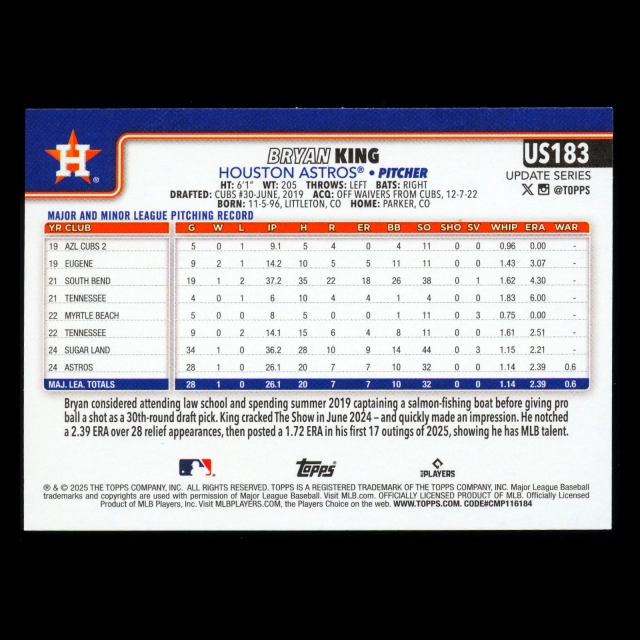 Bryan King RC 2025 Topps Update Rookie Astros