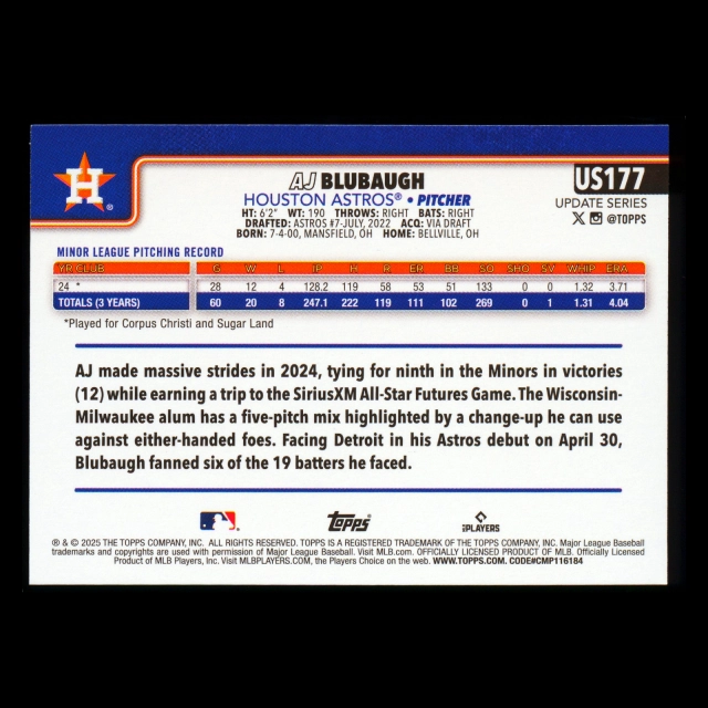 AJ Blubaugh RC 2025 Topps Update Rookie Astros
