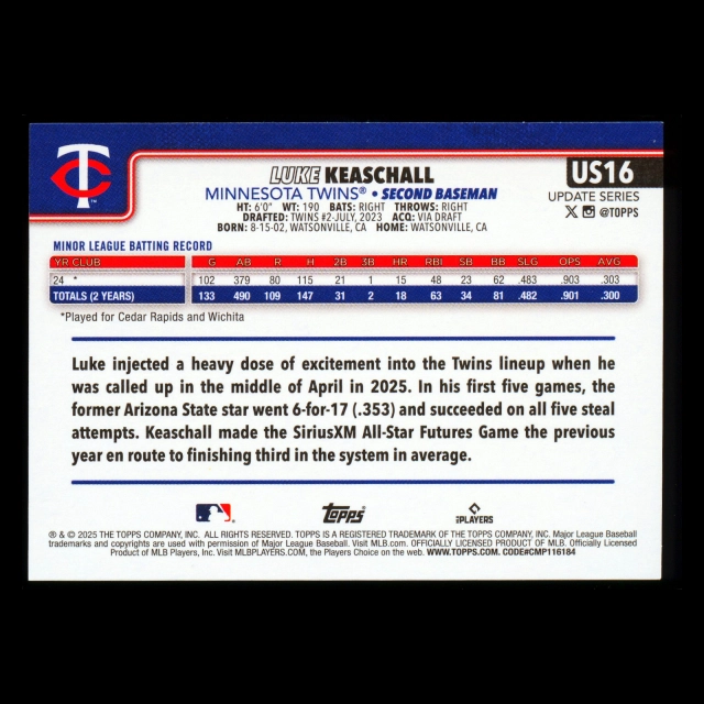 Luke Keaschall RC 2025 Topps Update Rookie Twins