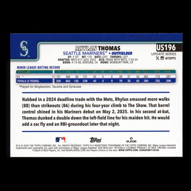 Rhylan Thomas RC 2025 Topps Update Rookie Mariners
