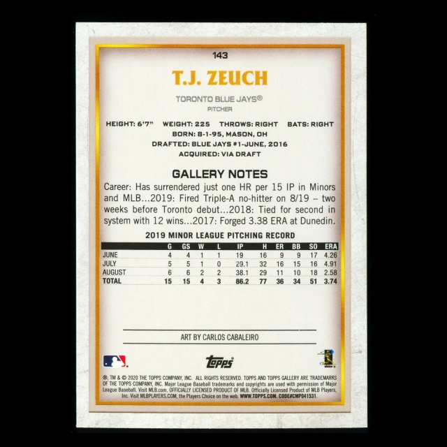 T.J. Zeuch RC 2020 Gallery Rookie Blue Jays