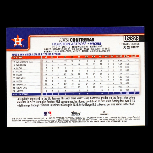 Luis Contreras RC 2025 Topps Update Rookie Astros